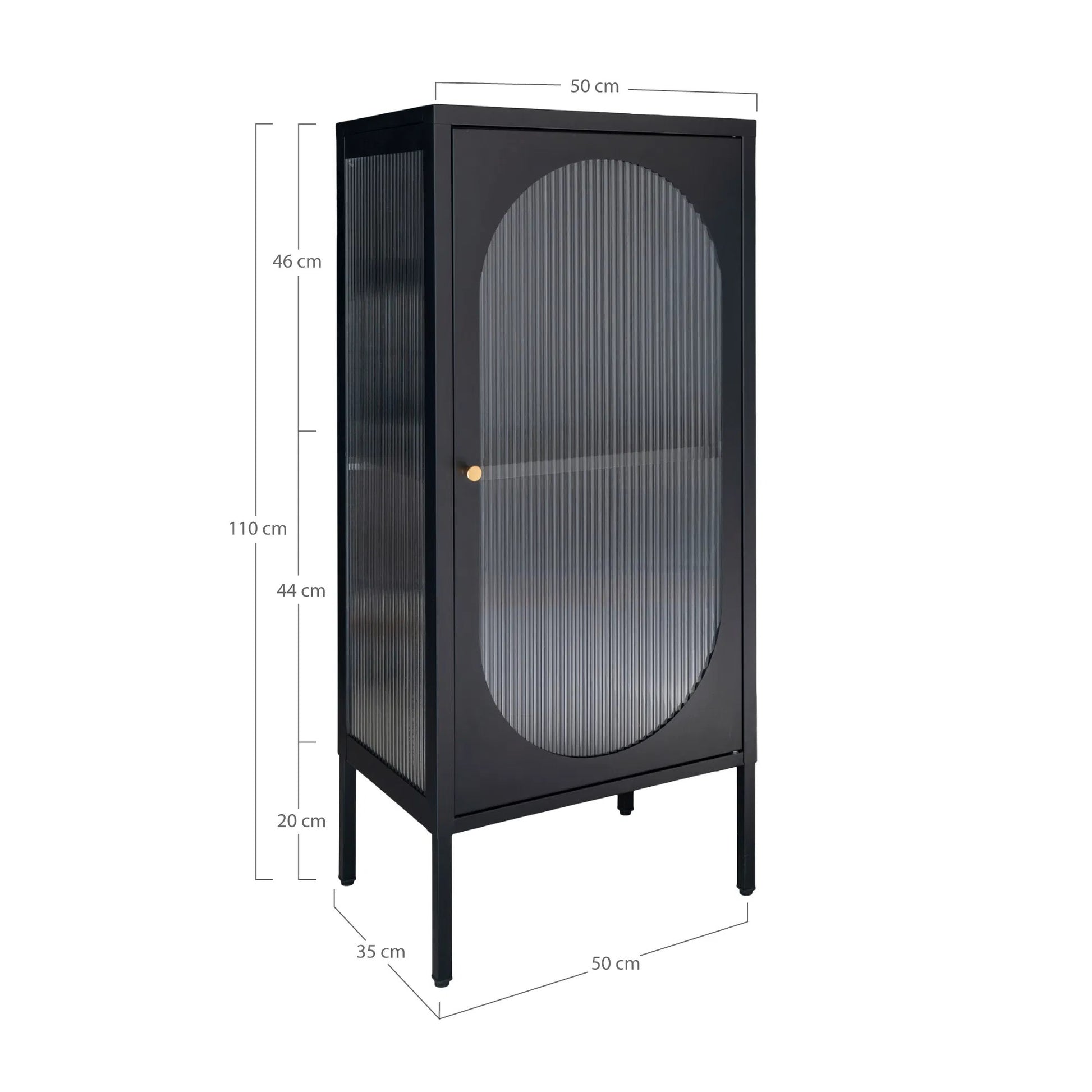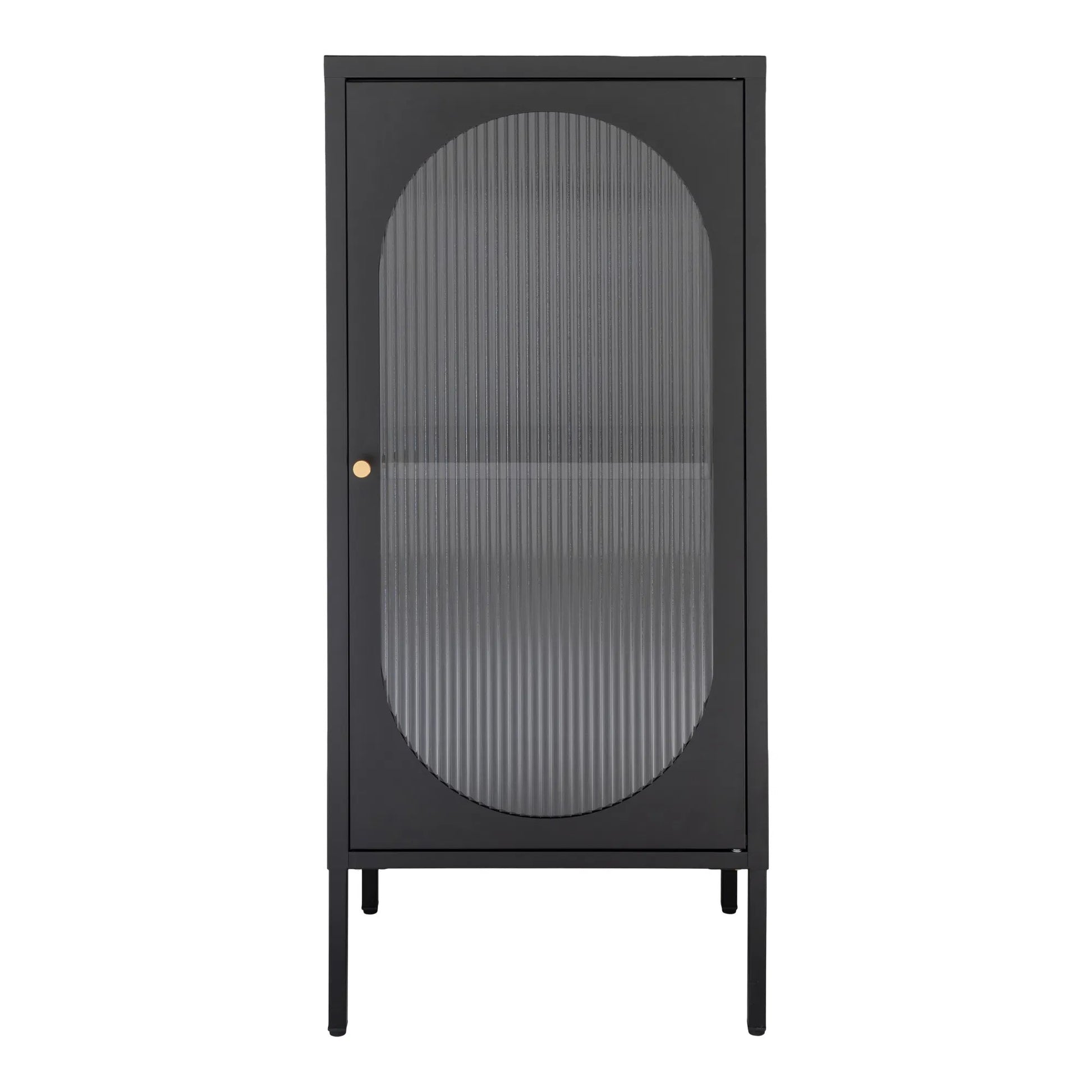 This one-door steel cabinet features eye-catching arched front windows and rippled glass panels, adding a touch of mid-century modern charm and making it a standout piece. Its sturdy construction and ample storage space make it the perfect place to store and display your favorite items. Beautiful and functional.